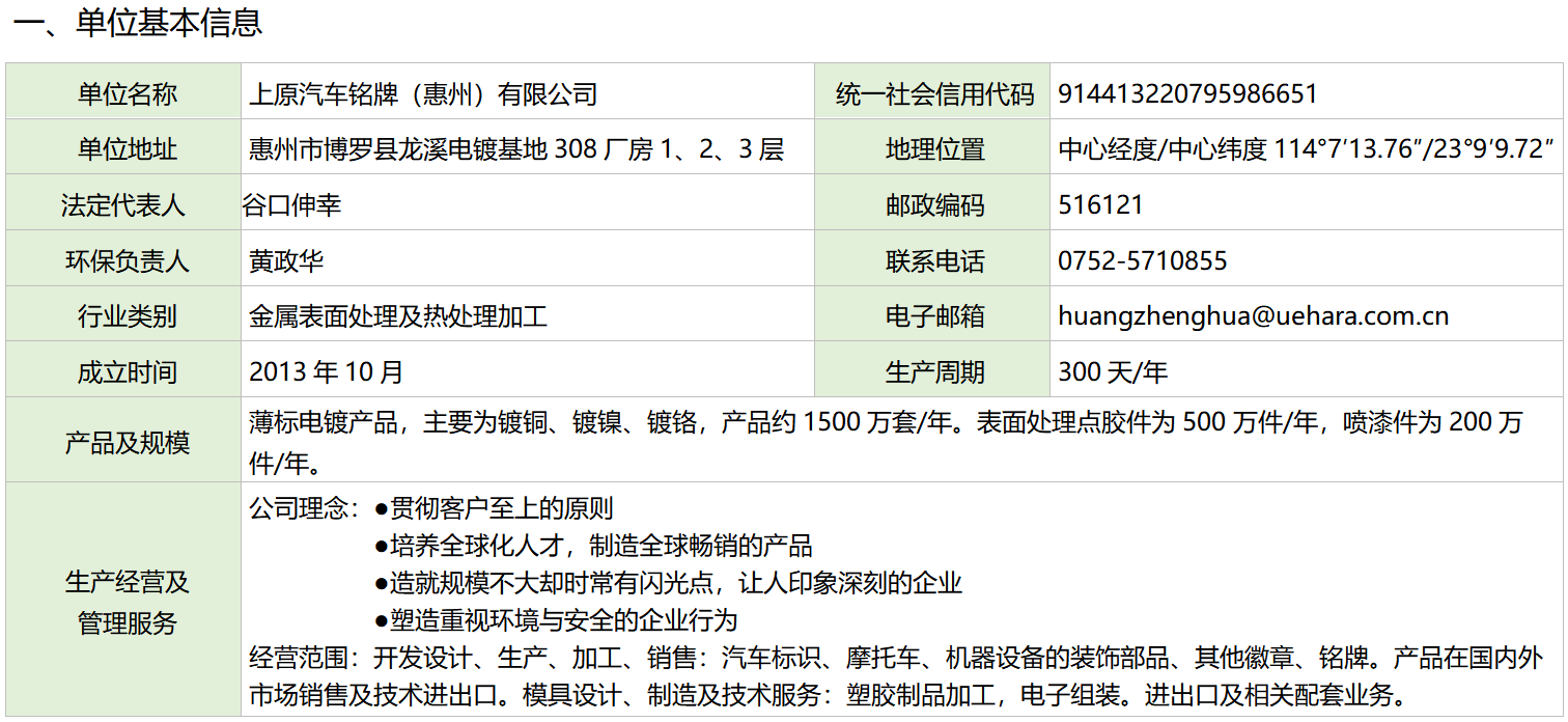 上原汽车铭牌(惠州)有限公司环境信息公示 (2018-2023)